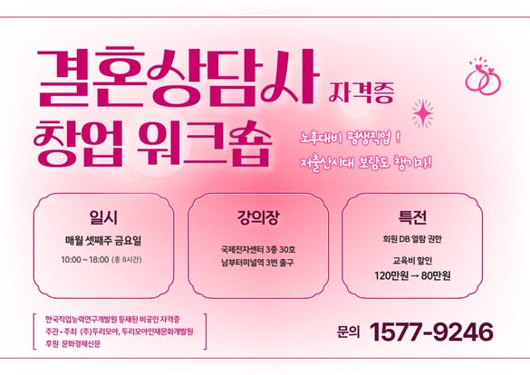강규남 기자 기사 등록일: 2025-09-09 커플매니저 자격증 강의가 매월 셋째주 금요일에 개최된다. 이번 강의는 창업 1·2급 통합 과정으로 진행되며, 시간은 오전 10시부터 오후 6시까지이다. 이를 통해 예비 커플 매니저들은 전문적인 기술과 지식을 습득할 수 있는 기회를 갖게 된다.참가비는 120만원에서 80만원으로 할인되며, 추가 자격증 취득에 대한 비...