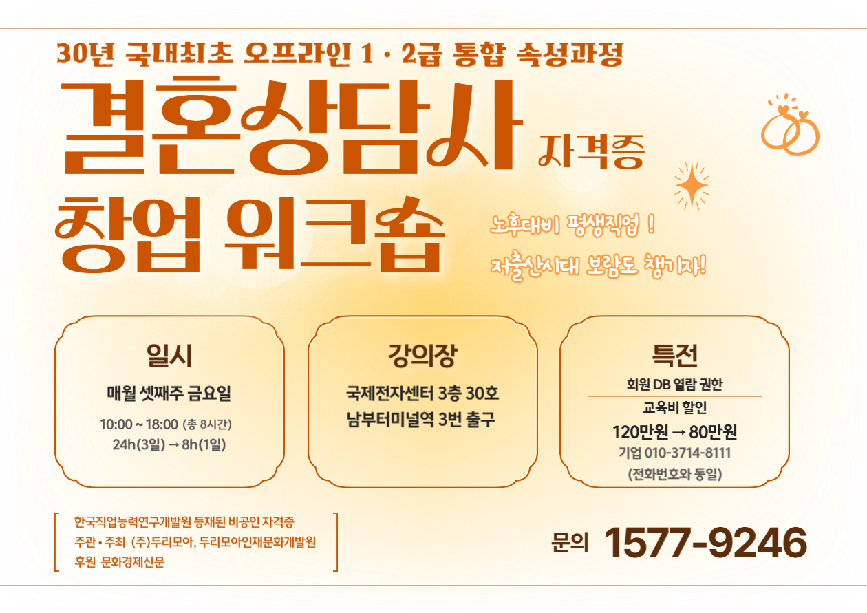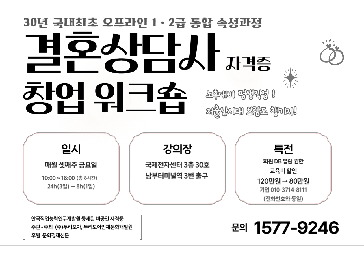 강규남(발행인 ,대표이사) 기자 기사 등록일: 2025-12-03 17;14;00 핵심 요약결혼상담사 자격증 교육 과정의 수강생 모집을 위해 10가지 주요 홍보 루트와 타겟별 맞춤 전략이 제시되었습니다. 온라인 플랫폼, 커뮤니티, SNS, 오프라인 제휴 등 다각적인 접근이 필수적이며, 협회 주관 강조, 강사진 전문성 부각, 실제 사례 공유 등 신뢰도 구축 콘텐츠가 중요합니다.최근 비혼 및 만혼 ...